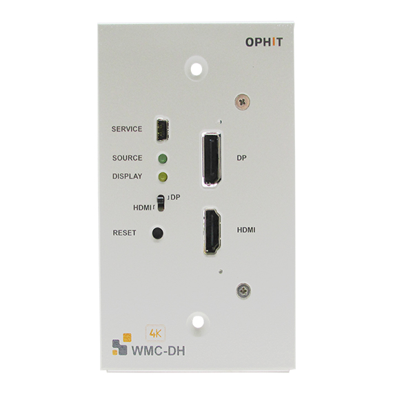 Ophit’s WMC-DH is an MPO/MTP-type wall plate video signal converter with an option to manually select the HDMI (2.0) or DisplayPort (1.2) input switch, transmitting high-speed